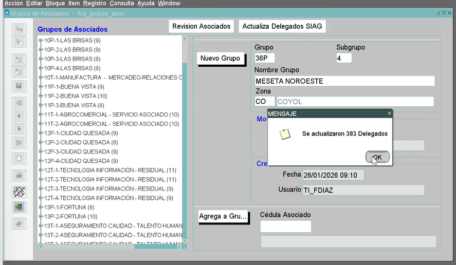 Asignación a grupo Delegados: Ingresar el dato de grupo al que pertenecen de delegados e informarle a los nuevos asociados sobre sus representantes.