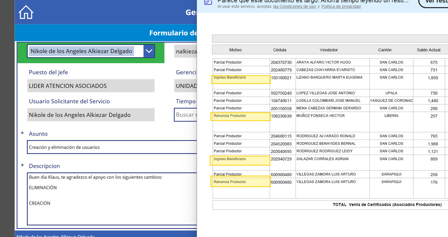 Se debe solicitar según el reporte e indicar cuales a eliminar y cuales a crear según el cuadro de movimientos de capital de la sesión, recordar que lo que son ingresos de beneficiarios, se debe solicitar también la inactivación del usuario del asociado fallecido, en ese caso el beneficiario no podrá ingresar más a la información de la finca pasada y en su nuevo perfil tendrá la información desde el momento de su ingreso.