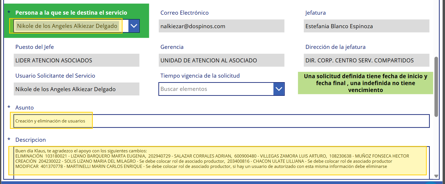 Se debe seleccionar como persona a la que se destina el servicio, a uno mismo ya que no hay asociado activo al cual asignar, esto permite crear una solicitud la cual nuestra Gerencia debe de aprobar (Actualmente Ana Fressy)