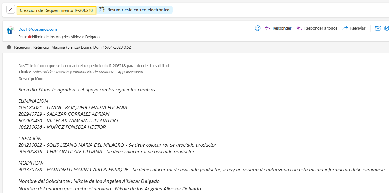Ya que se crea el caso, el encargado de roles y perfiles generará los usuarios y nos informará una vez que queden listos.