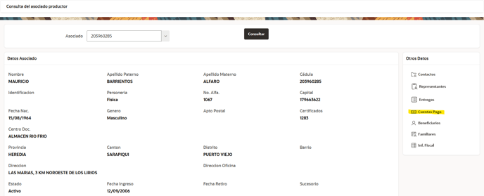 - Cuentas para el pago de programas especiales y excedentes: se identifican como "Datos pago asociado" y acá se depositan excedentes anuales, programa de calidad de leche, programa de ausencia de antibiótico y cualquier otro pago adicional definido por el consejo.