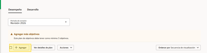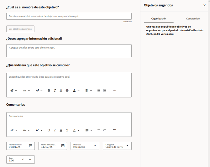 Si apareciera un error indicando que el % es menor o mayor, se debe ajustar los pesos de manera que los objetivos tengan un peso total de 100%.