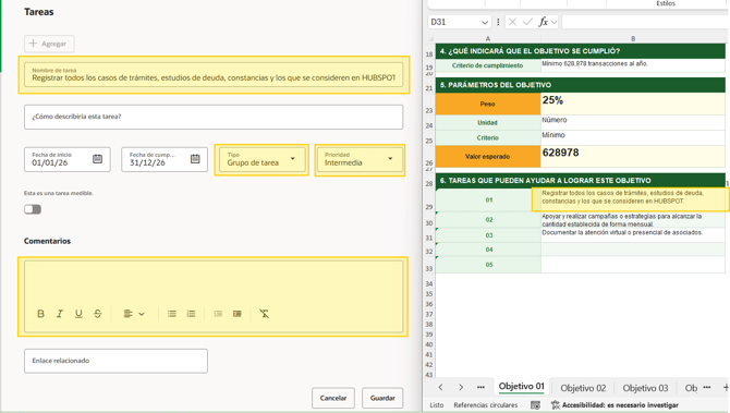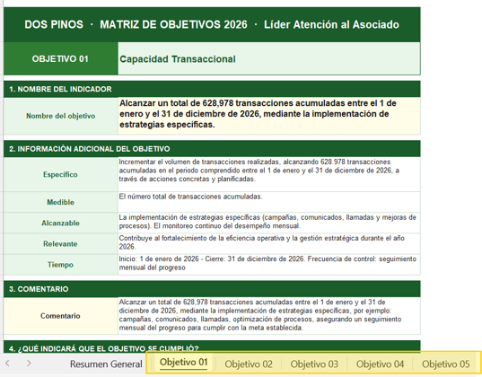 El excel de objetivos será brindado por el líder del área para su debido cargado y será informado el límite de plazo para cargar la información en sistema.