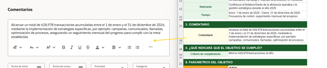 En lo que respecta a los valores de fecha de inicio y final, depende si es un objetivo constante o puntual (en caso de proyectos con un plazo establecido) y en Categoría se debe poner la dirección a la que pertenecemos.