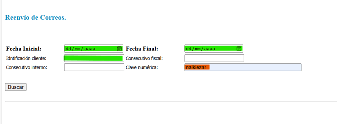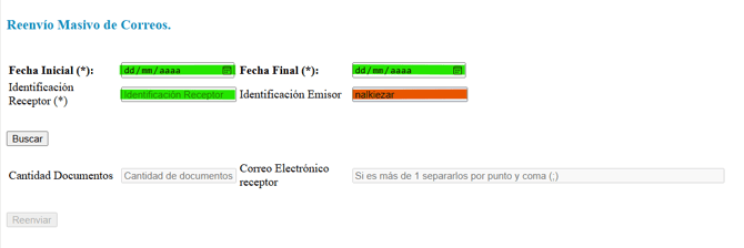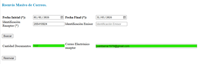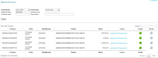 - Al buscar se podrá visualizar la cantidad de documentos y el correo autorizado para envío de facturas electrónicas, se da en reenviar para hacerlo de manera masiva.
