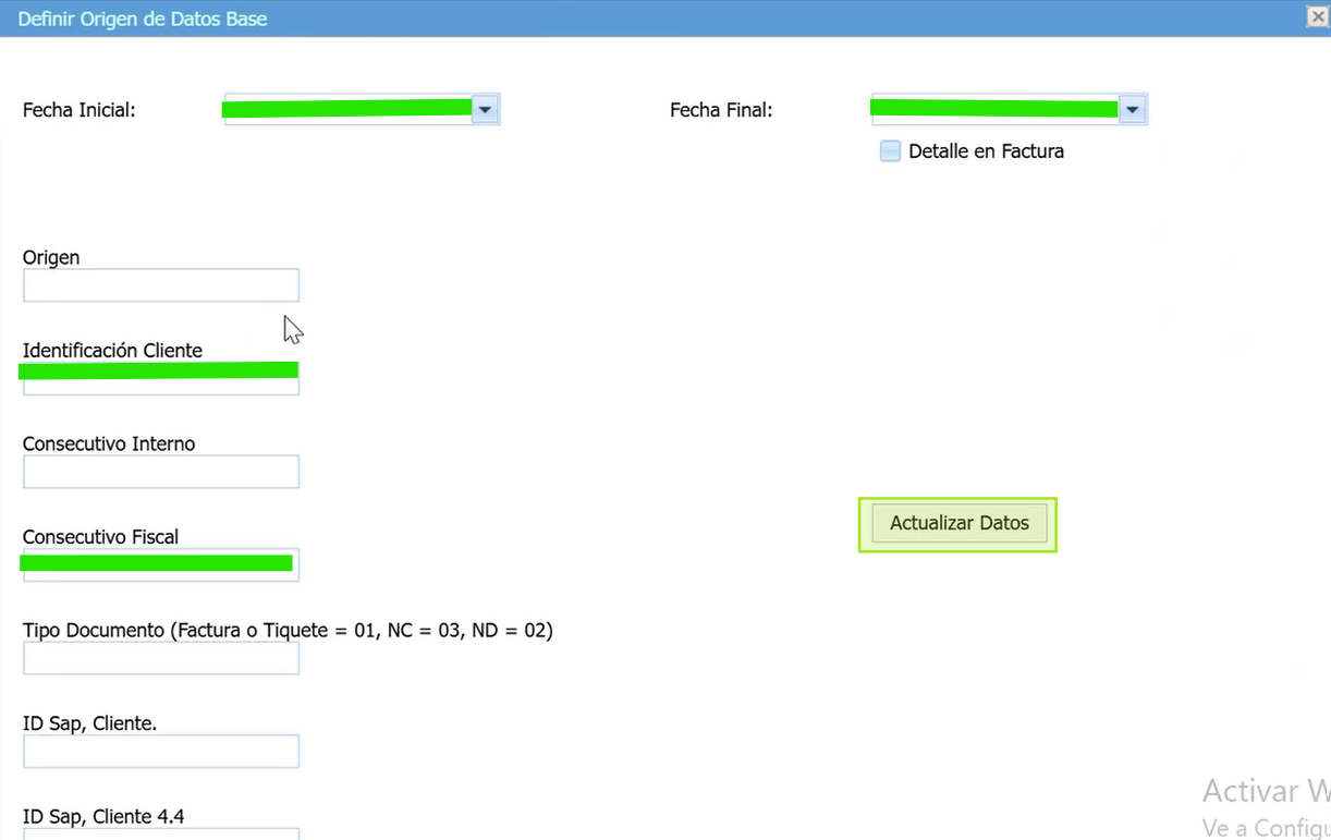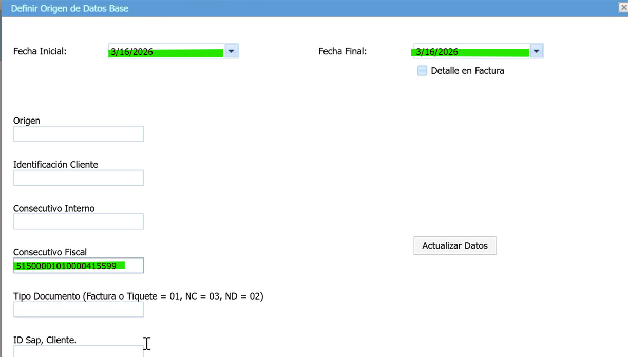 Acá se abrirá una ventana en la cual se debe colocar la información correspondiente de fecha, cédula y consecutivo (este se puede sacar el primer reporte, donde se ve el botoncito rojo)