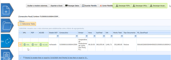 - Y ya realizada la búsqueda se podrá descargar el documento correspondiente, se puede seleccionar uno solo para bajar todos o bien,se puede colocar en seleccionar todos para bajar los documentos de varias facturas.