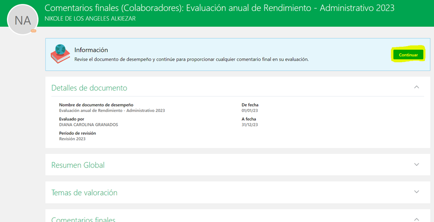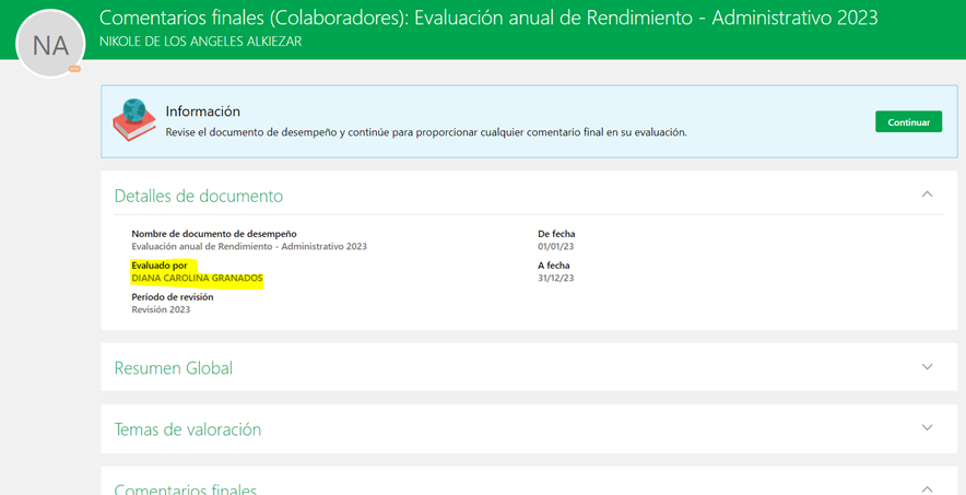 Una vez revisados los diversos comentarios que evidencian la evaluación de la jefatura sobre el cumplimiento de cada objetivo, se procede a completar con un último comentario para dar clausura.