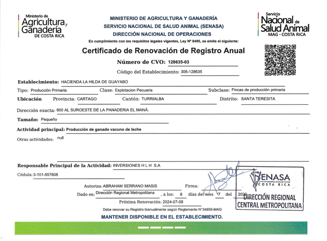 El Certificado de Veterinario de Operación conocido como CVO, es un documento oficial del Servicio Nacional de Salud Animal (SENASA) que autoriza a establecimientos a operar con productos de origen animal (en nuestro caso leche de vaca), garantizando el cumplimiento de normas sanitarias para actividades como fabricación de productos lácteos de consumo humano.