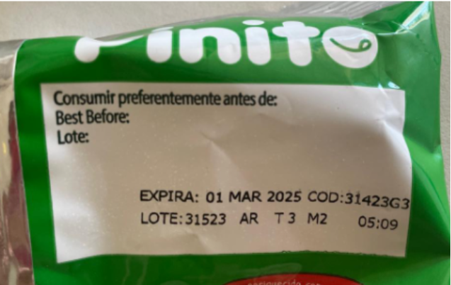 Ejemplo: abollado, inflado, olor o coloración extraña, fecha de vencimiento borrosa, etc. |