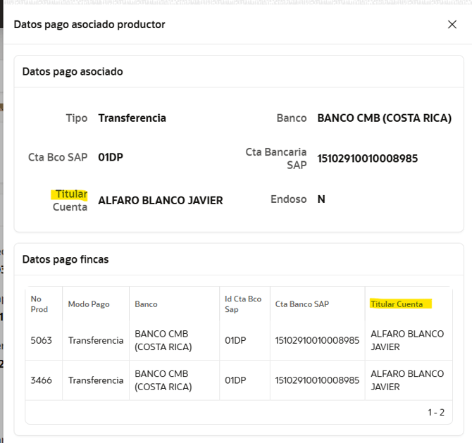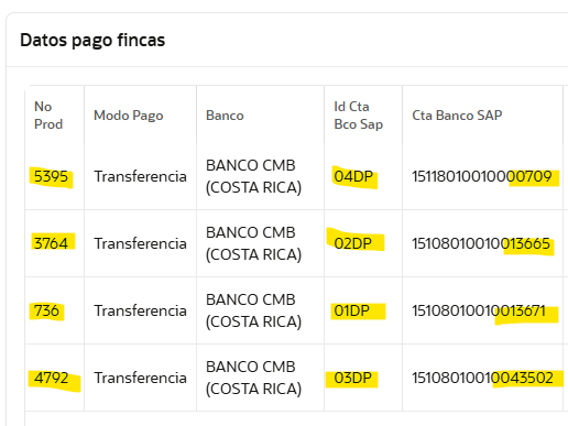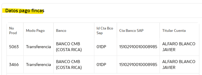 - Cuentas para el pago de leche y venta de ganado: se identifican como "Datos pago fincas" que como mencionamos previamente pueden ajustarse de manera individual por cada unidad productiva, siempre respetando que ambas cuentas deben estar a título personal