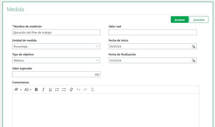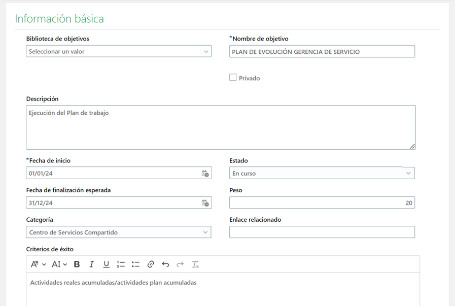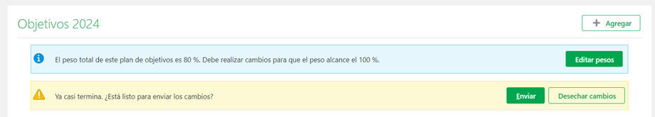 Si apareciera un error indicando que el % es menor o mayor, se debe ajustar los pesos de manera que los objetivos tengan un peso total de 100%.