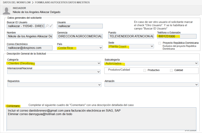- En este caso, el asociado desea utilizar un solo correo para todo se solicita incluir este nuevo correo electrónico y se pone la categoría TODO.